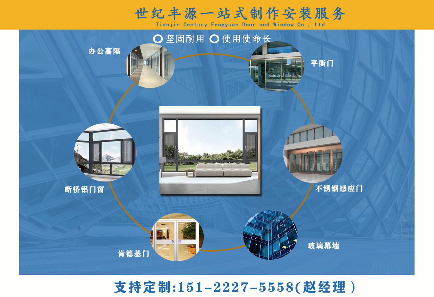 天津世紀豐源門窗有限公司從事斷橋鋁門窗,玻璃幕墻,平衡門,肯德基門,不銹鋼感應門,百葉窗,辦公高隔,制作安裝一站式訂制生產及配套服務等?! 」咀猿闪⒁詠恚冀K堅持以人才為本、誠信立業的經營原則,薈萃業界精英,成熟的技術、管理方法及企業經驗與國內企業的具體實際相結合,為企業供給各個方面的解決方案,使企業在激烈的市場競爭中始終堅持競爭力,實現企業快速、穩定地發展。 質量好、服務好、才能信譽好,公司已在諸多領域取得輝煌成績,愿意成為您可信賴的長期合作伙伴。 讓我們攜手同行,共同實現“讓普通老百姓都用得上高端門窗”...